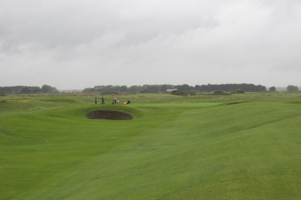 The approach at the short par-four twelfth, voted today as the favorite hole… and there were many favorites, to be quite honest. In case you’re wondering… the favorite hole selected by our group today was #12, the shortest par-4 on the course. At 361 yards, the landforms in the fairway mean everything….yes, landforms. So that is now two out of three days that the twelfth hole has been selected, and once as a runner-up. The middle of the round….fascinating. Tomorrow we’re off to Royal Cinque Ports, another links course, only about three miles down the road from RSG, closer to the seaside town of Deal. And the weather… is supposed to be clear.